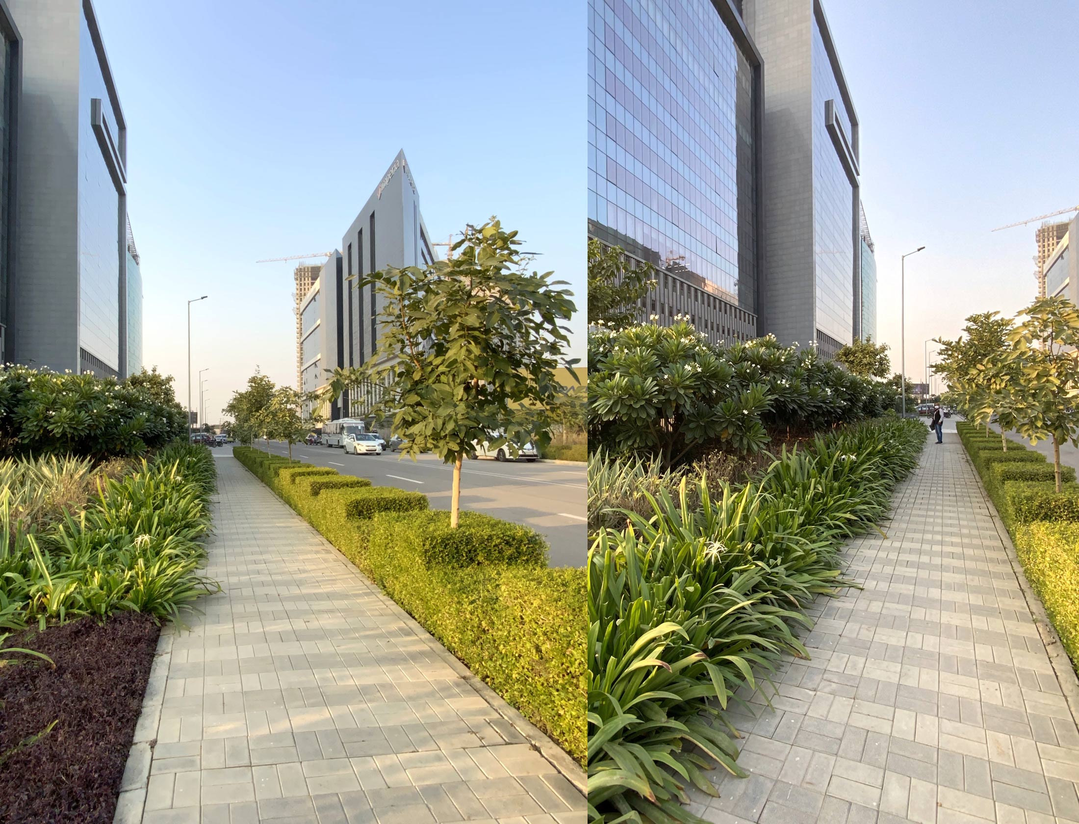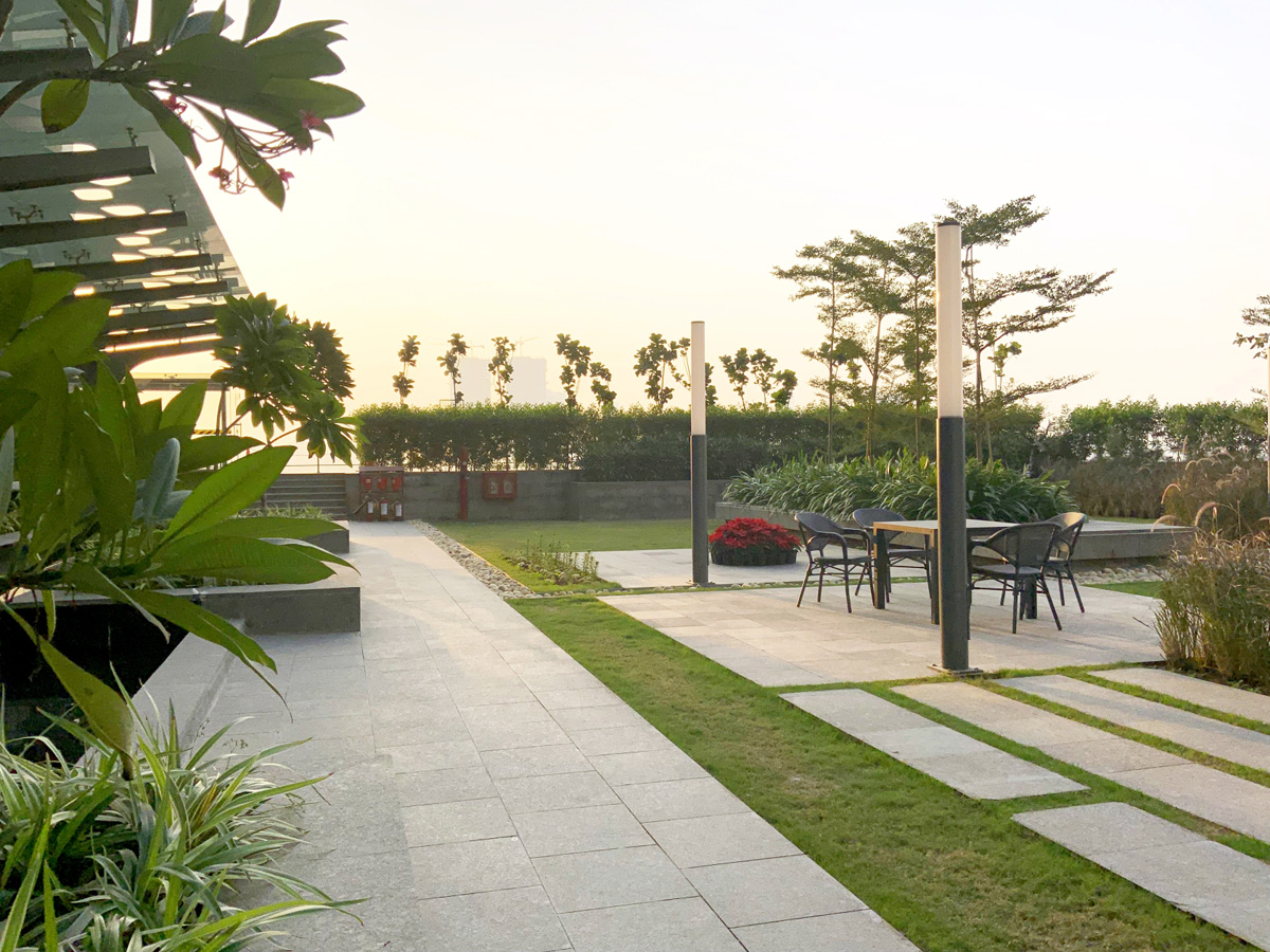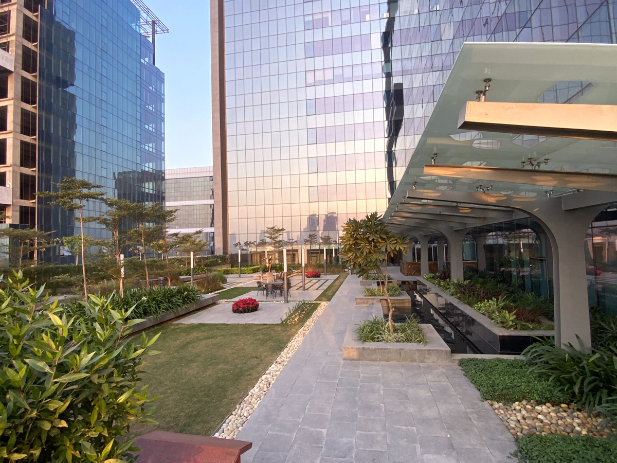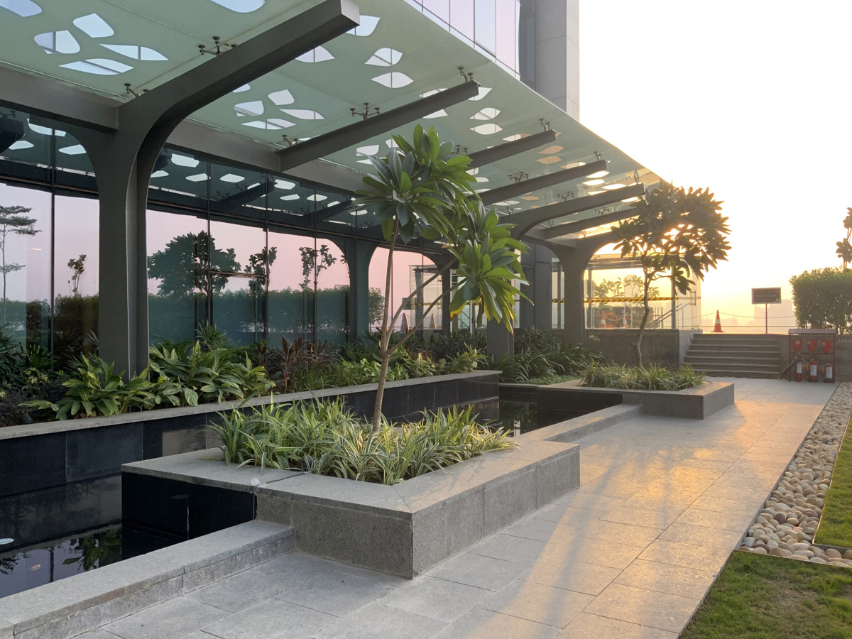 AIPL Business Club, Gurgaon, stands out from a large foreground plaza with its stark, crisp facade massing, interspersed with multiple terraces and landscaped decks, making it one of the most upmarket and contemporary workspaces in Gurgaon. The green glades on both sides of the corner plot add to its foreground depth, complemented by an articulate streetscape design along the abutting roads