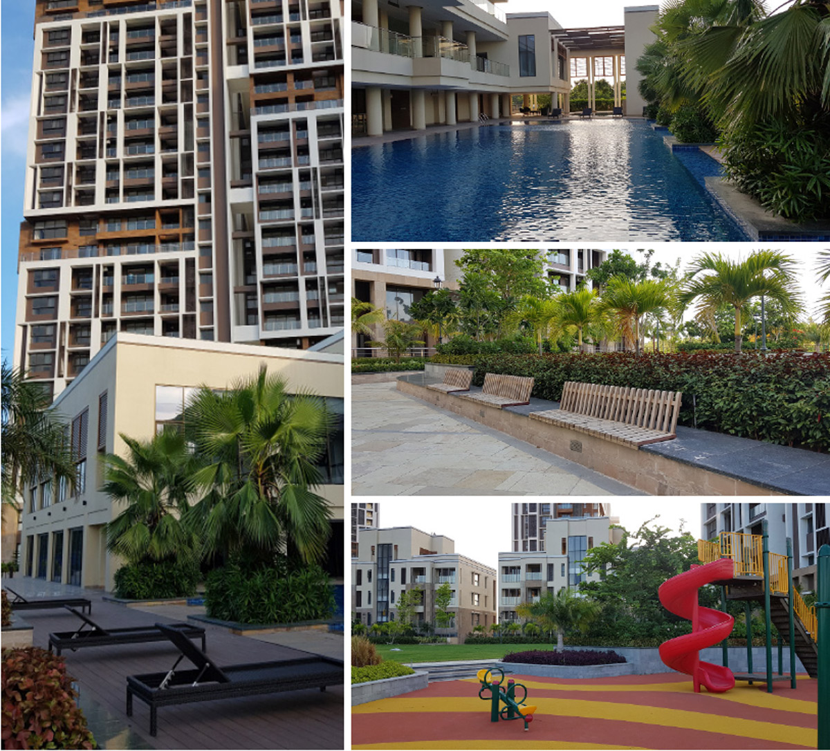 Inspired by the architecture of old Kolkata and the city's cultural context, this contemporary landscape setting offers a range of outdoor spaces, from the grandeur of a large arrival area to a small, cozy nook in the rear gardens. The landscape design also features a wide urban avenue as a central spine, which flows into podiums and club gardens, resplendent with rich tropical planting.