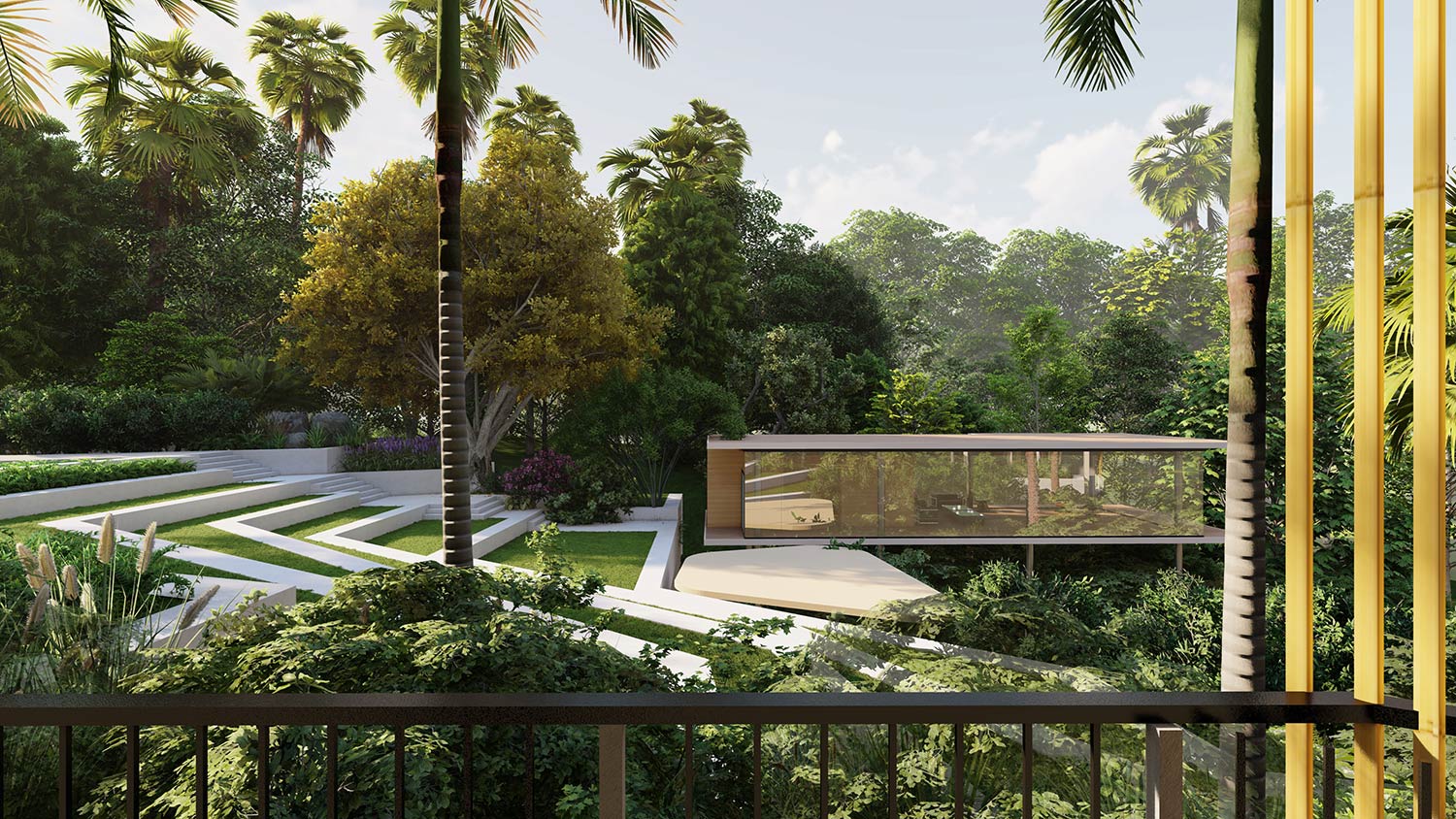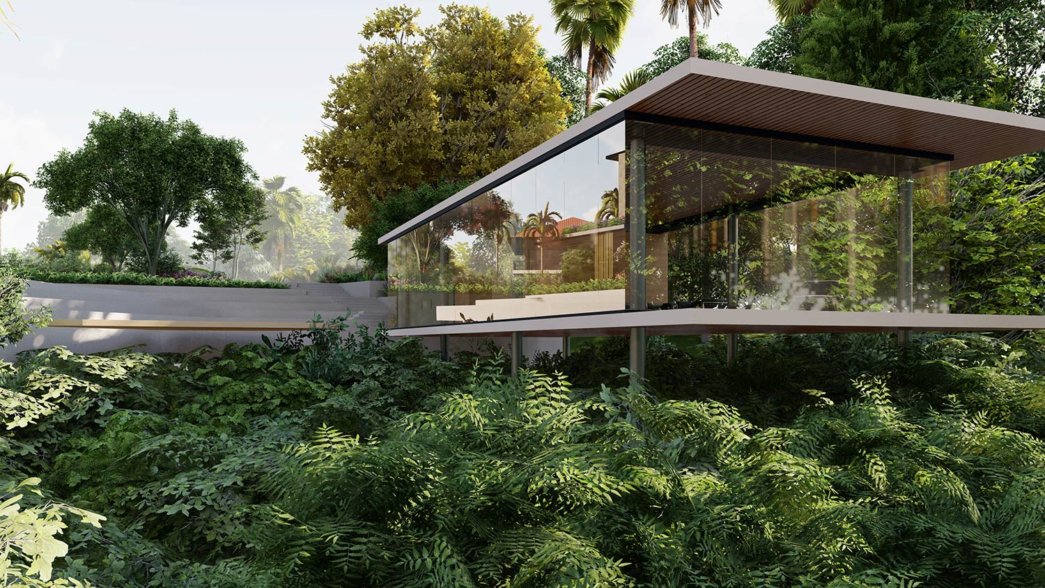 The architectural style blends local elements, such as pitched roofs designed for high rainfall, with modern aesthetics and the use of bamboo in the façade to reflect the region's character. The rooms face inward, overlooking a sharply terraced garden that cascades into the valley. Across the terraced garden, a floating glass pavilion perched atop the trees offers a panoramic view, providing an immersive experience of the serene landscape.